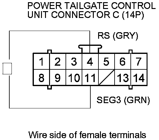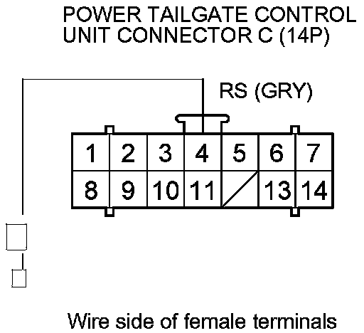 13. Check for continuity between power tailgate control unit connector C (14P) terminal No. 4 and body ground.