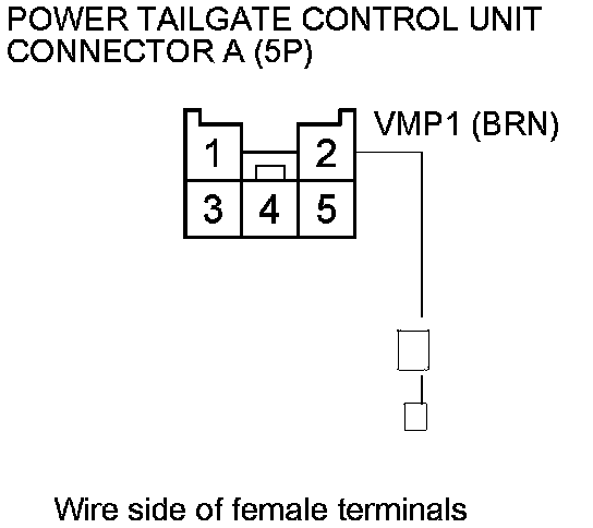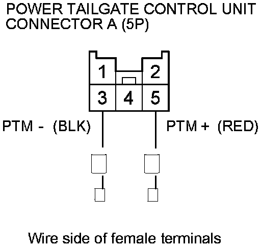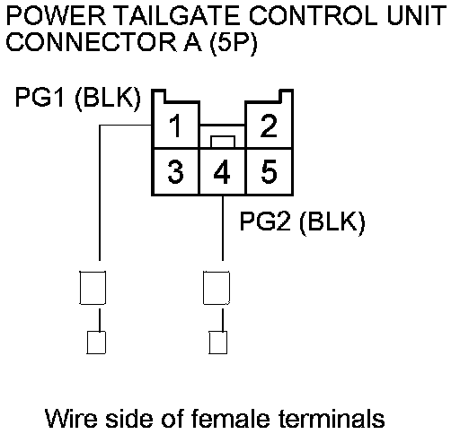 11. Connect battery power to power tailgate control unit connector A (5P) terminal No. 3 (or No. 5) and ground the terminal No. 5 or (No. 3).