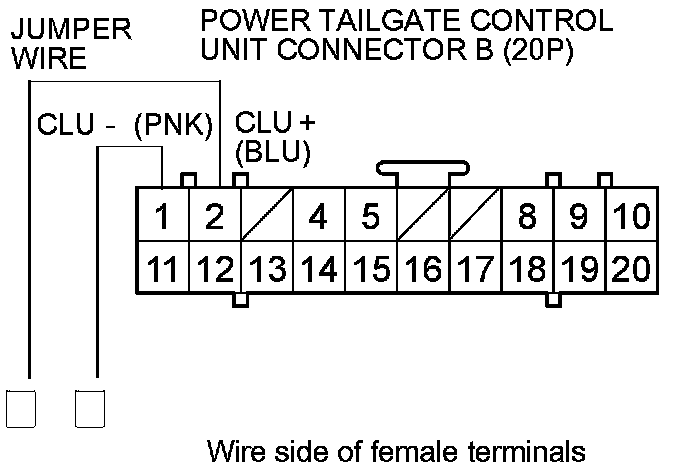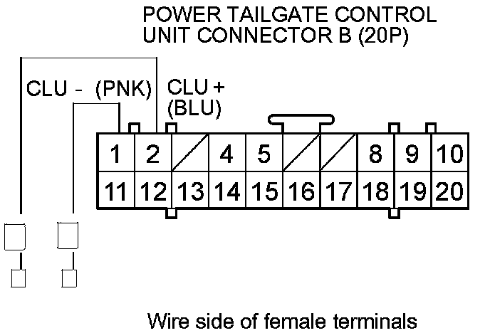 17. Connect battery power to power tailgate control unit connector B (20P) terminal No. 1 and ground the terminal No. 2. Check for clutch operation.