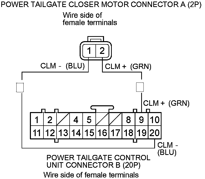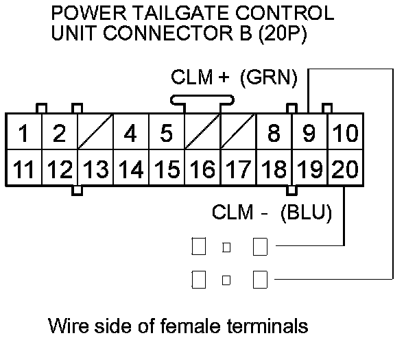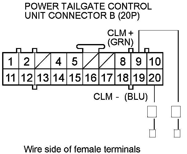 17. Connect battery power to the power tailgate control unit connector B (20P) terminal No. 9 (or No. 20) and ground the terminal No. 20 (or No. 9) momentarily.