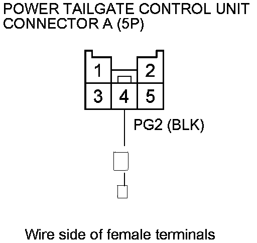 14. Check for continuity between power tailgate control unit connector A (5P) terminal No. 4 and body ground.