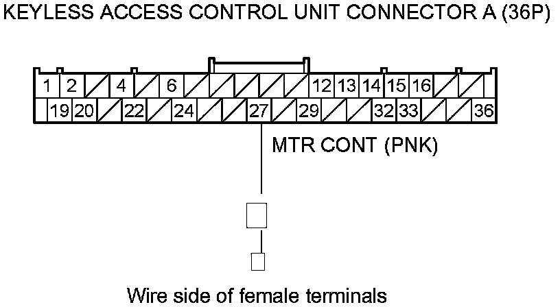 5. Measure the voltage between body ground and keyless access control unit connector A (36P) terminal No. 27.