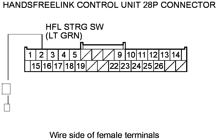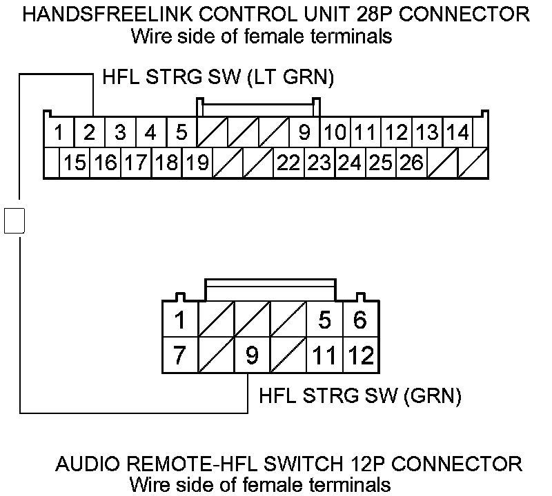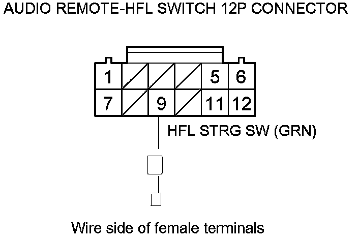 12. Check for continuity between HandsFreeLink control unit 28P connector terminal No. 2 and audio remote-HFL switch 12P connector terminal No. 9.