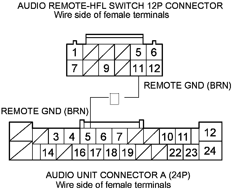 18. Check for continuity between audio remote-HFL switch 12P connector terminal No. 11 and audio unit connector A (24P) terminal No. 5.