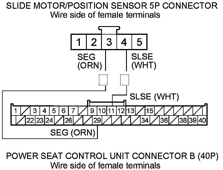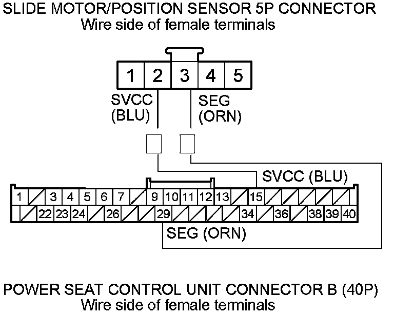 20. Check for continuity between power seat control unit connector B (40P) terminals No. 15 and No. 29 and slide motor/position sensor 5P connector terminals No. 2 and No. 3 respectively.