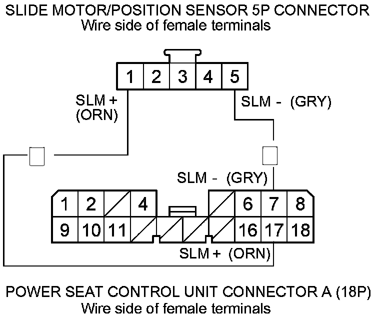 29. Check for continuity between power seat control unit connector A (18P) terminals No. 17 and No. 7 and slide motor/position sensor 5P connector terminals No. 1 and No. 5 respectively.