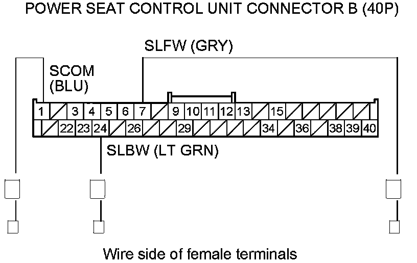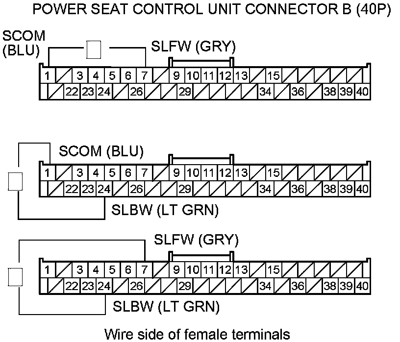 9. Check for continuity between these power seat control unit connector B (40P) terminals: