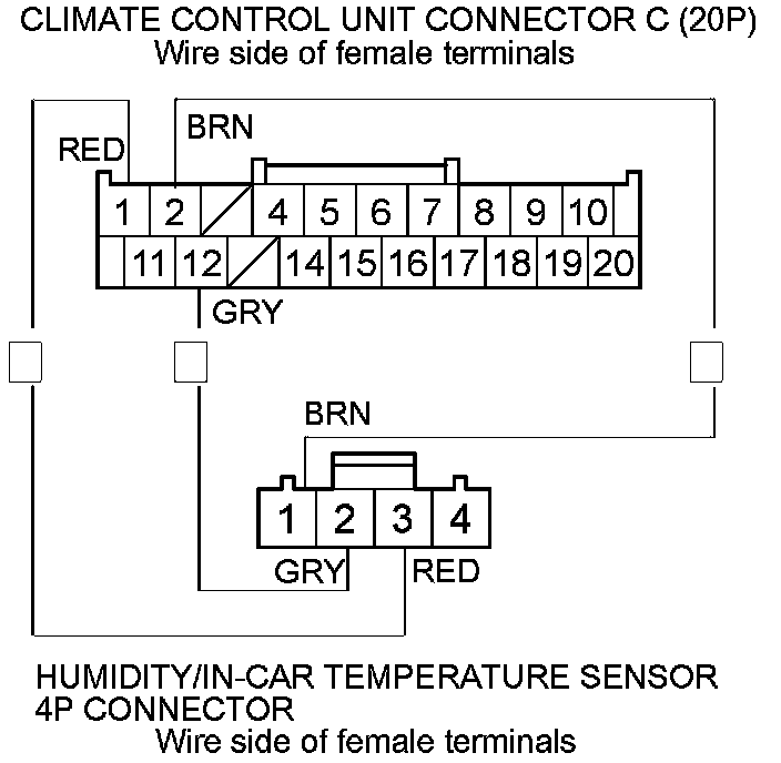 9. Check for continuity between the following terminals of climate control unit connector C (20P) and the humidity/in-car temperature sensor 4P connector.