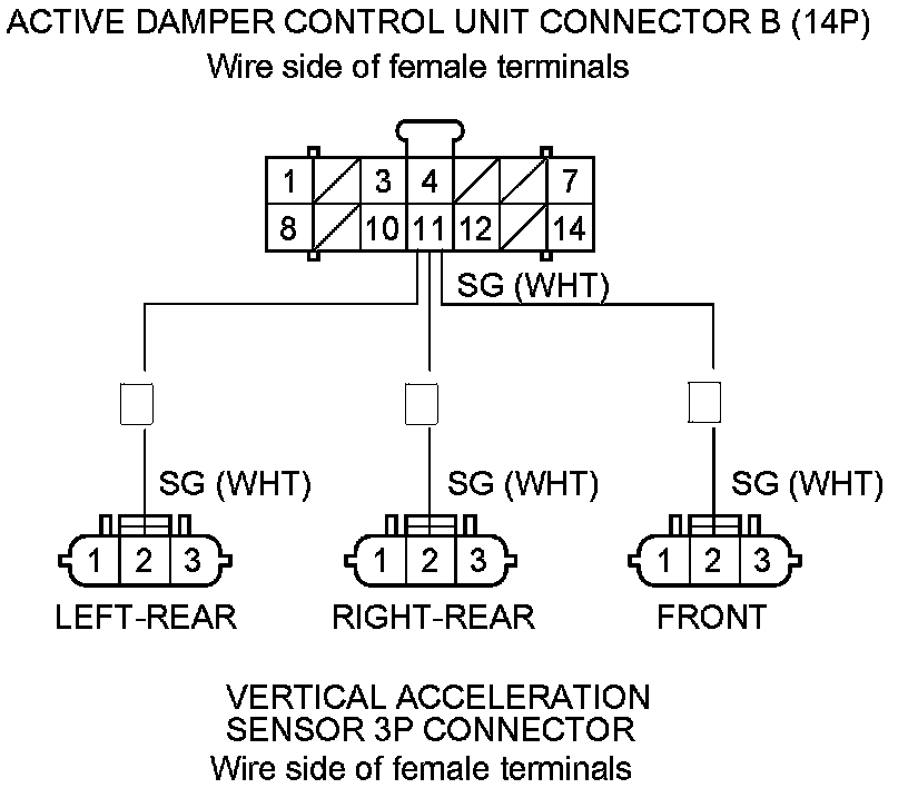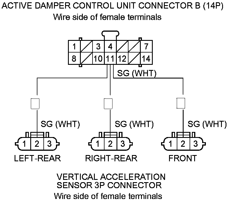 13. Check for continuity between active damper control unit connector B (14P) terminal No. 11 and appropriate vertical acceleration sensor 3P connector terminal No.2.