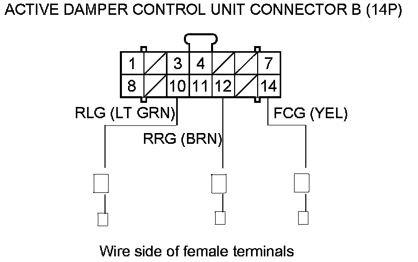 17. Measure the voltage between body ground and the appropriate active damper control unit connector B (14P) terminal individually.