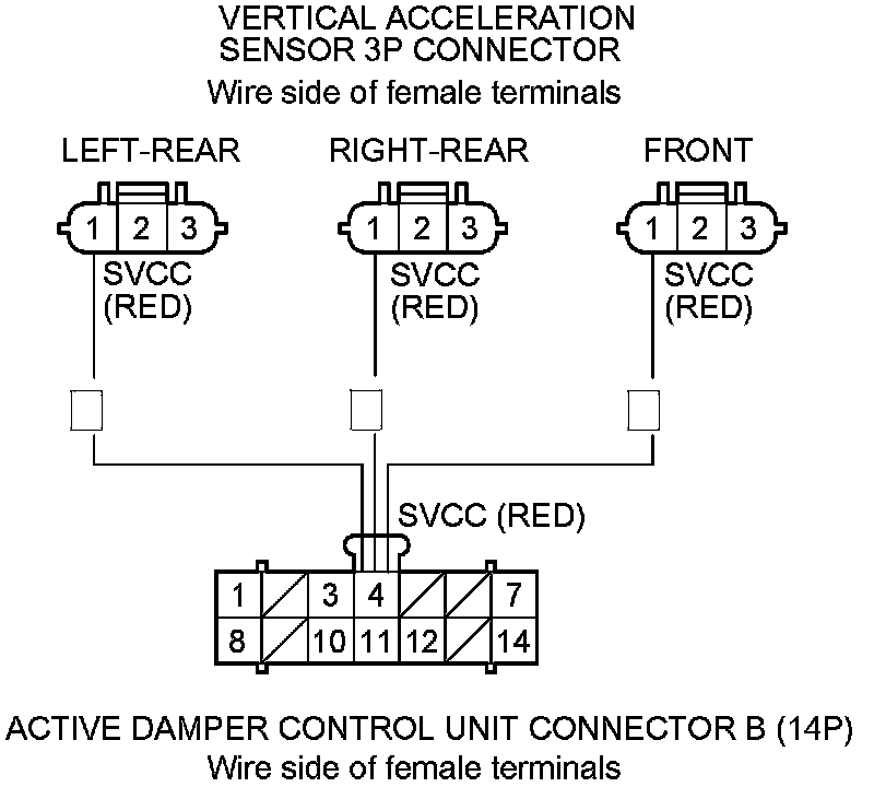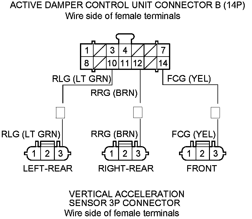 18. Check for continuity between the appropriate active damper control unit connector B (14P) terminal and appropriate vertical acceleration sensor 3P connector terminal No. 3.