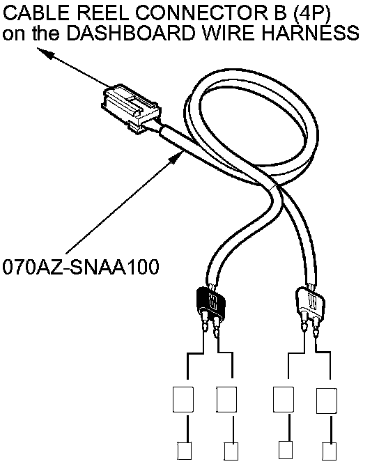 7. Connect the terminals of SRS simulator lead J to the SRS inflator simulator (2 Ohms connectors), and then connect the SRS simulator lead J to the driver's airbag inflator 4P connector on the cable reel harness.