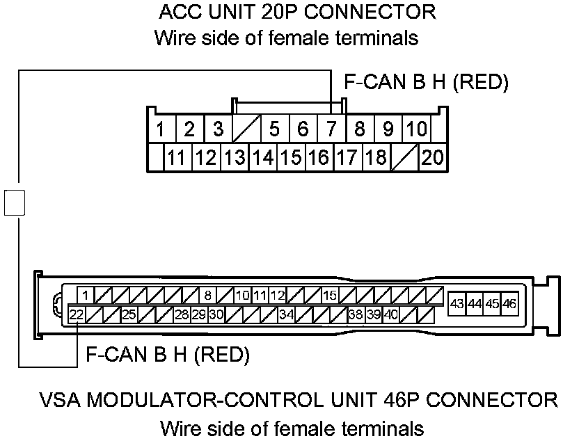 11. Check for continuity between ACC unit 20P connector terminal No. 7 and VSA modulator-control unit 46P connector terminal No. 22.