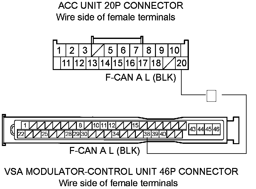 17. Check for continuity between ACC unit 20P connector terminal No. 20 and VSA modulator-control unit 46P connector terminal No. 38.