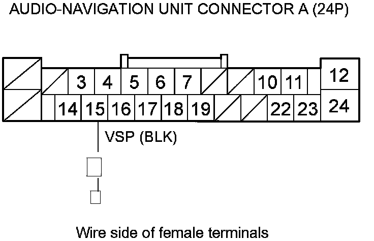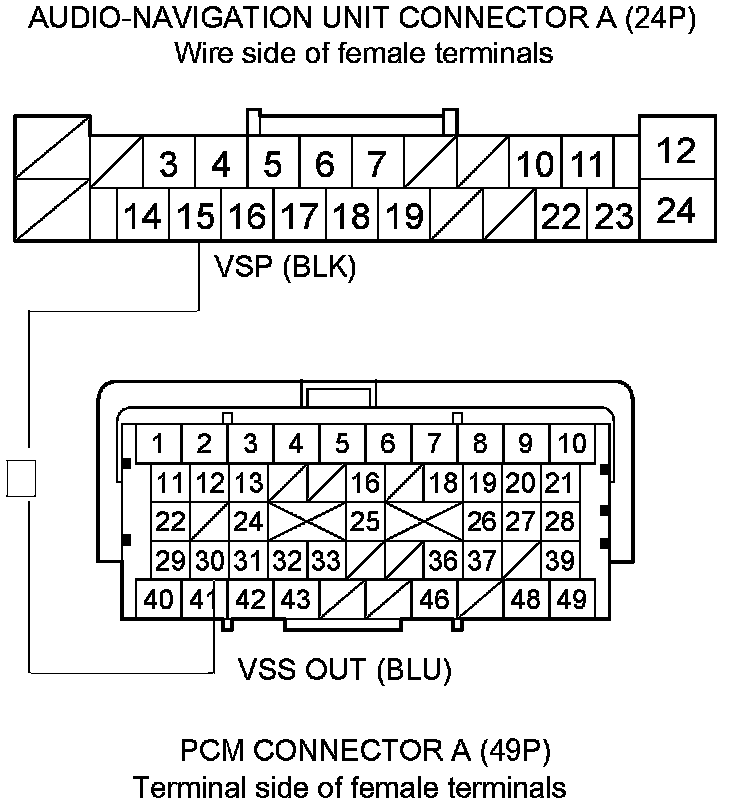 13. Check for continuity between audio-navigation unit connector A (24P) terminal No. 15 and PCM connector A (49P) terminal No. 30.