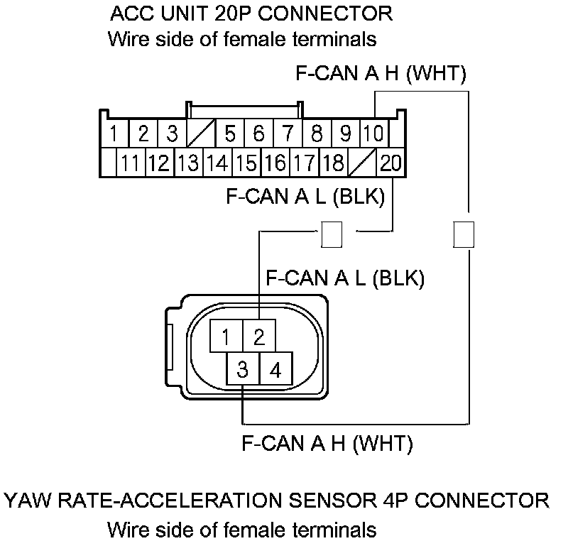 8. Wait for 30 seconds, then check for continuity between ACC unit 20P connector terminal No. 10 and yaw rate-acceleration sensor 4P connector terminal No. 3, and between ACC unit 20P connector terminal No. 20 and yaw rate-acceleration sensor 4P connector terminal No. 2.