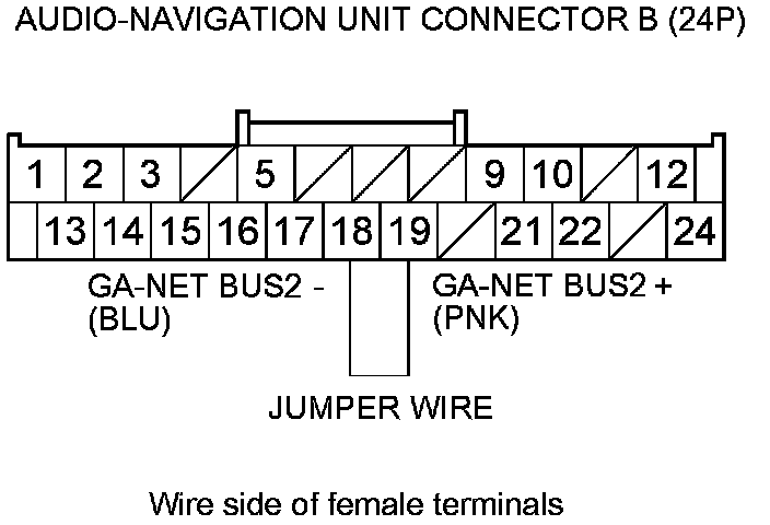 7. Connect audio-navigation unit connector B (24P) terminals No. 18 and No. 19 with a jumper wire.