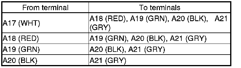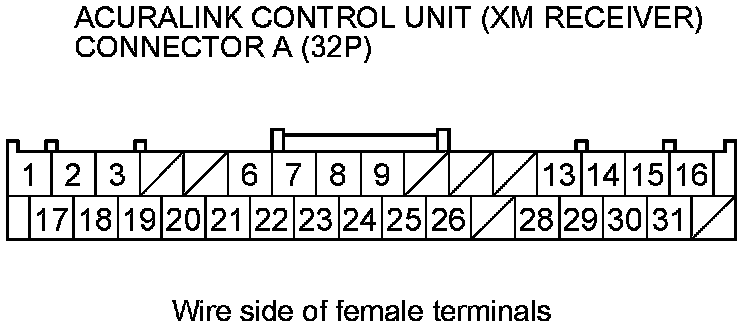 16. Check for continuity between AcuraLink control unit (XM receiver) connector A (32P) terminals according to the table.
