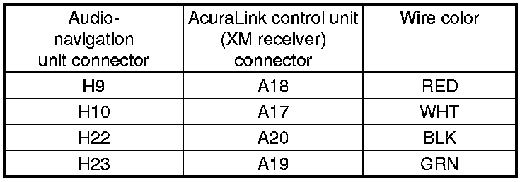 17. Check for continuity between audio-navigation unit connector H (28P) terminals and AcuraLink control unit (XM receiver) connector A (32P) terminals according to the table.