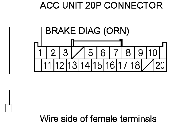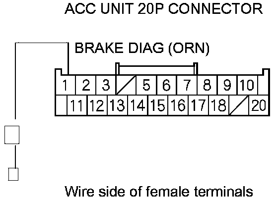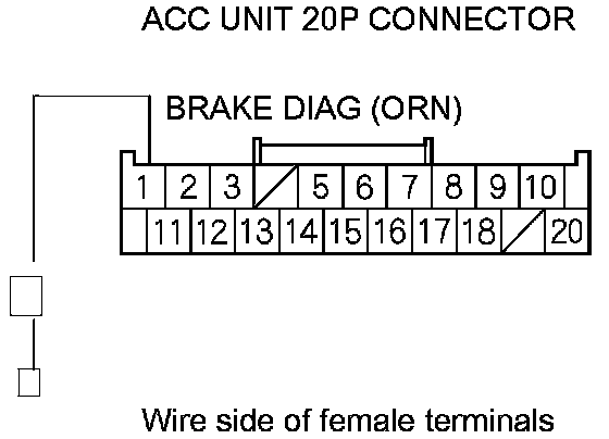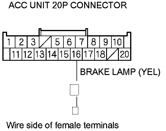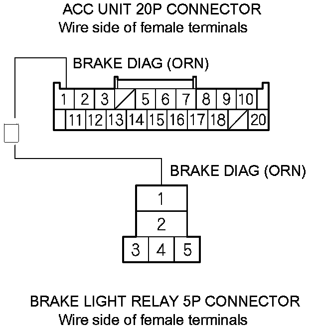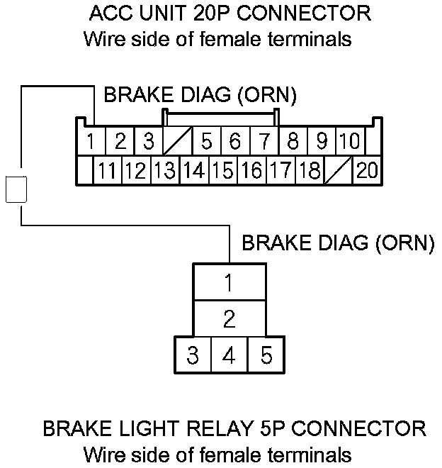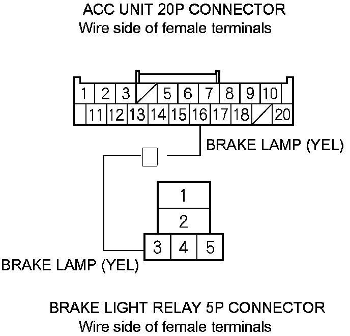 21. Measure the resistance between ACC unit 20P connector terminal No. 1 and brake light relay 5P connector terminal No. 1. There should be less than 1.0 Ohms.