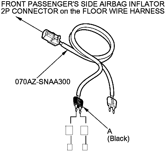 6. Disconnect the front passenger's side airbag inflator 2P connector (A) on the floor wire harness.