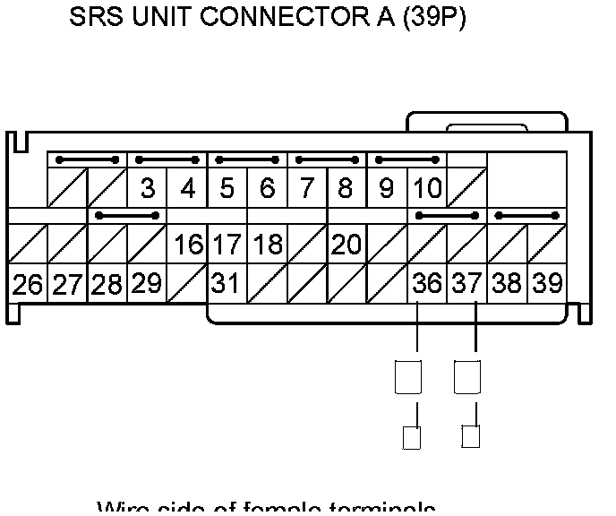 16. Measure the resistance between SRS unit connector A (39P) terminals No. 36 and No. 37. There should be less than 1.0 Ohms.