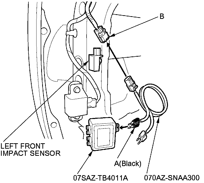 15. Connect the black terminal of SRS simulator lead L (A) to the SRS inflator simulator (jumper connector), and then connect the SRS simulator lead L to the left front impact sensor 2P connector (B) on the left engine compartment wire harness.