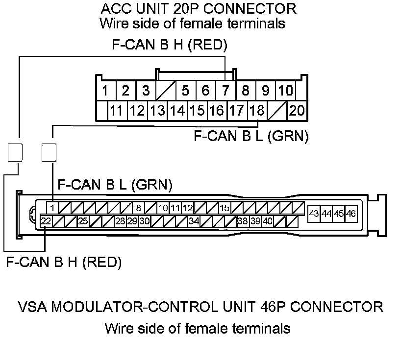 12. Check for continuity between ACC unit 20P connector terminals No.7 and VSA modulator-control unit 46P connector terminals No.22, and between ACC unit 20P connector terminals No.18 and VSA modulator-control unit 46P connector terminals No.1.