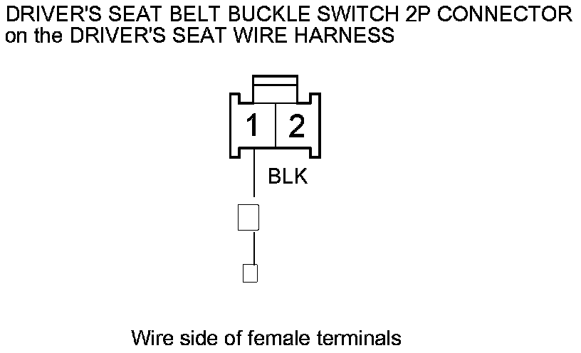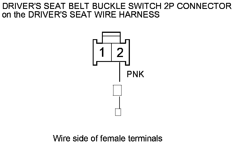 15. Measure the resistance between driver's seat belt buckle switch 2P connector on the driver's seat wire harness terminal No. 1 and body ground. There should be less than 1.0 Ohms.
