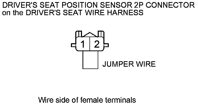12. Install a jumper wire between driver's seat position sensor 2P connector on the driver's seat wire harness terminals No. 1 and No. 2.