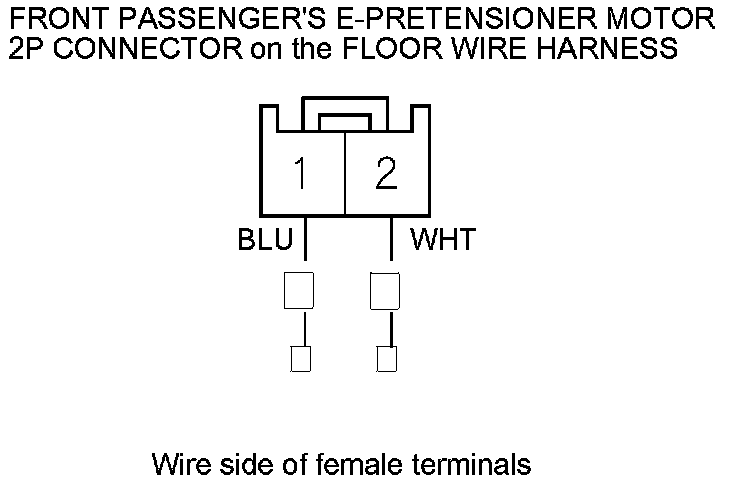 16. Measure the resistance between body ground and front passenger's E-pretensioner motor 2P connector on the floor wire harness terminals No. 1 and No. 2 individually. There should be an open circuit or at least 1 MOhms.