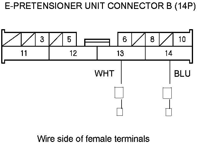 11. Measure the voltage between body ground and E-pretensioner unit connector B (14P) terminals No. 13 and No. 14 individually. There should be less than 0.2 V.