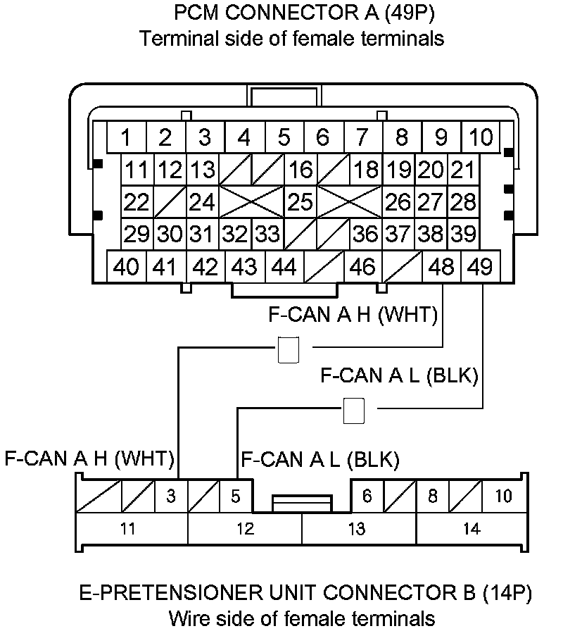 14. Check for continuity between E-pretensioner unit connector B (14P) terminals No. 3 and PCM connector A (49P) terminals No. 48, and between E-pretensioner unit connector B (14P) terminals No. 5 and PCM connector A (49P) terminals No. 49.