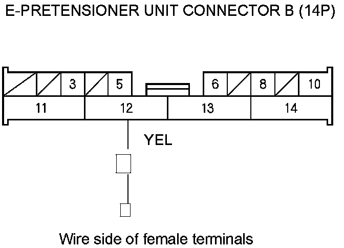 12. Measure the voltage between body ground and E-pretensioner unit connector B (14P) terminal No. 12. There should be battery voltage.