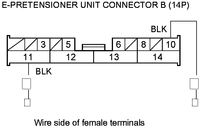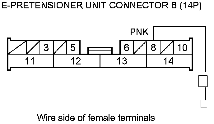 12. Measure the voltage between body ground and E-pretensioner unit connector B (14P) terminal No. 8. There should be battery voltage.
