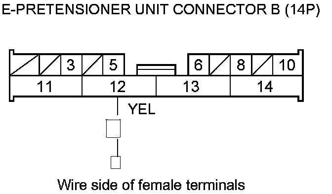 13. Measure the voltage between body ground and E-pretensioner unit connector B (14P) terminal No. 12. There should be battery voltage.