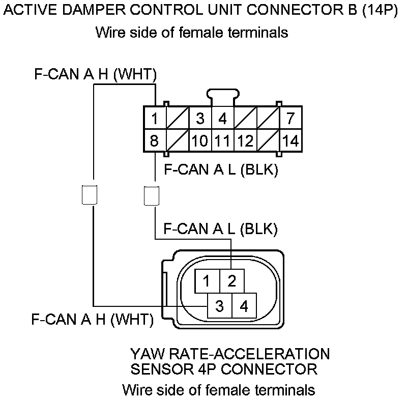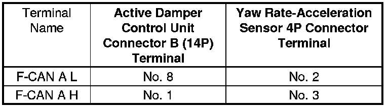 11. Check for continuity between the active damper control unit connector B (14P) terminals and the yaw rate-acceleration sensor 4P connector terminals individually.