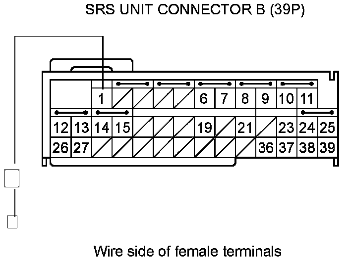 16. Measure the resistance between body ground and SRS unit connector B (39P) terminal No. 1. There should be an open circuit or at least 1 MOhms.