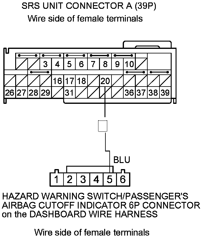 8. Measure the resistance between SRS unit connector A (39P) terminal No. 20 and hazard warning switch/passenger's airbag cutoff indicator 6P connector on the dashboard wire harness terminal No. 5. There should be less than 1.0 Ohms.