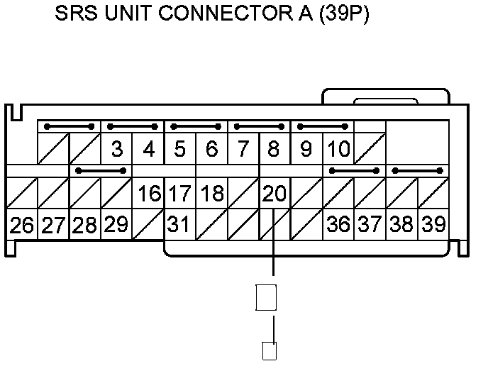 9. Measure the resistance between body ground and SRS unit connector A (39P) terminal No. 20. There should be an open circuit or at least 1 MOhms.
