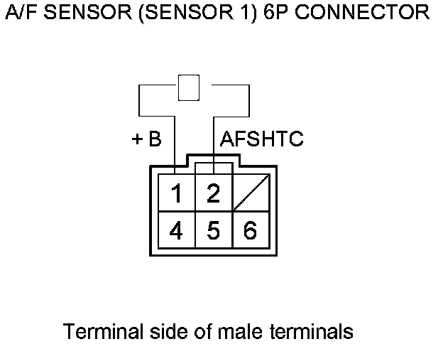 10. At the sensor side, measure the resistance between A/F sensor (Sensor 1) 6P connector terminals No. 1 and No. 2.