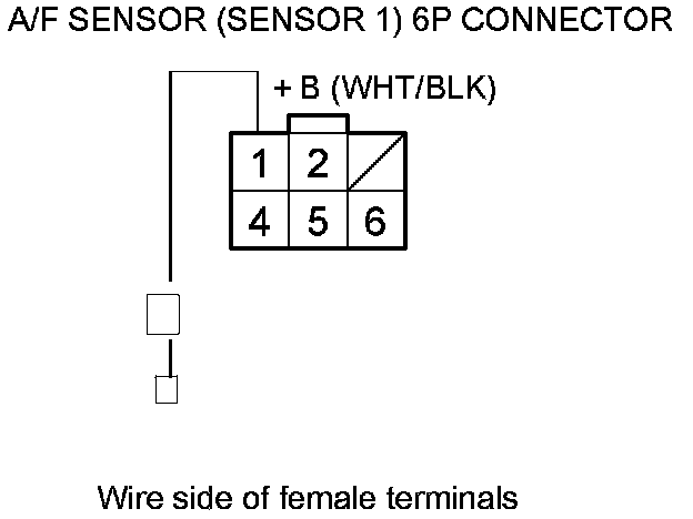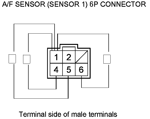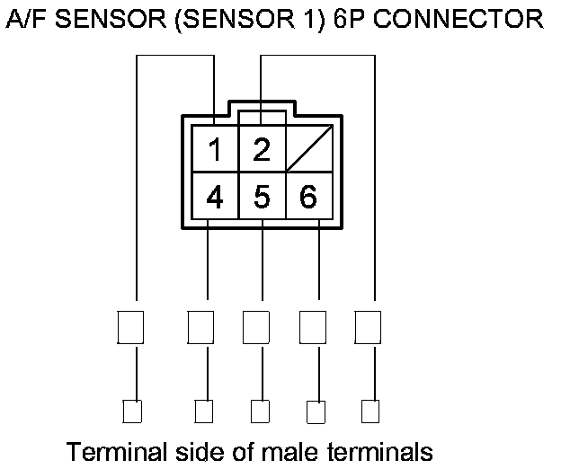 12. At the sensor side, check for continuity between A/F sensor (Sensor 1) 6P connector terminal No. 1 and each of the other terminals in the connectors individually.