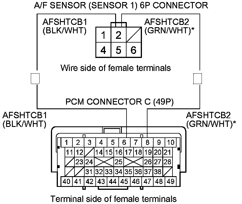 16. Check for continuity between A/F sensor (Sensor 1) 6P connector terminal No. 2 and PCM connector C6 (C8)*.