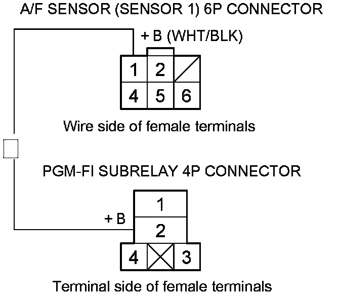 17. Check for continuity between A/F sensor (Sensor 1) 6P connector terminal No. 1 and PGM-FI subrelay 4P connector terminal No. 2.