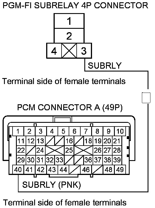 19. Check for continuity between PGM-FI subrelay 4P connector terminal No. 3 and PCM connector terminal A40.