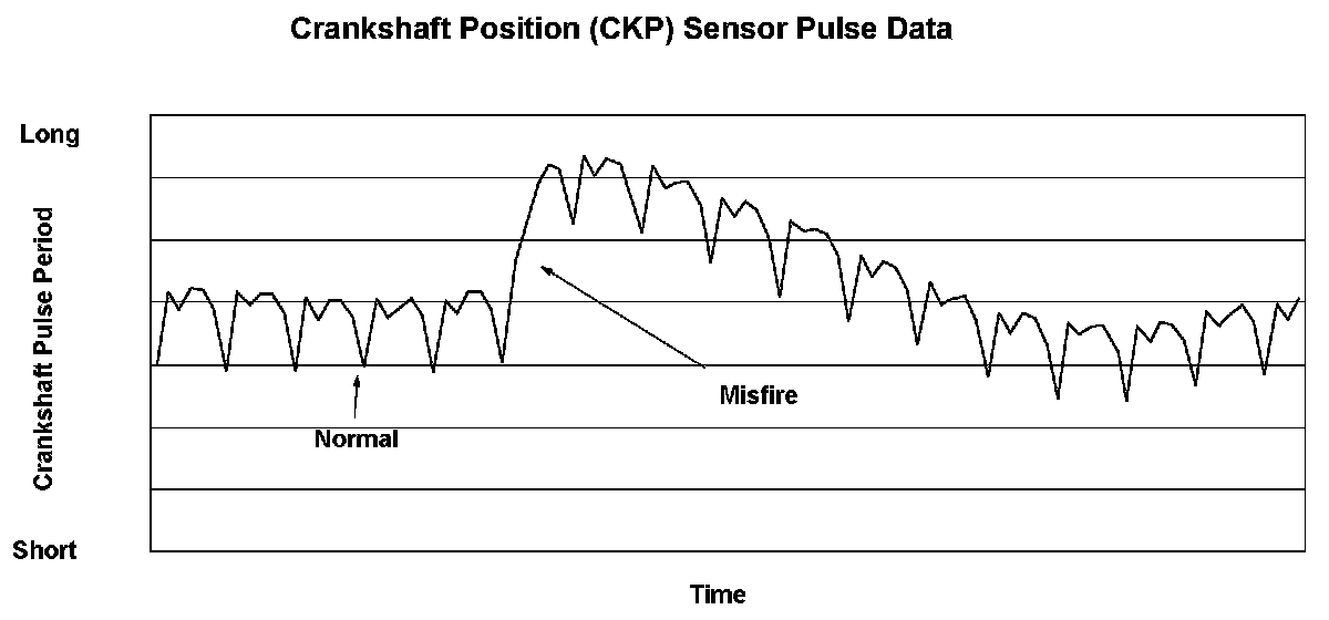 The crankshaft vibrates slightly when each cylinder fires. If a misfire occurs, the crankshaft rotation speed changes rapidly. The powertrain control module (PCM) monitors the crankshaft rotation speed based on the output pulses from the crankshaft position (CKP) sensor. By monitoring changes in the crankshaft rotation speed, the PCM counts the number of misfires and determines which cylinder is misfiring. If more than one DTC from P0301 through P0306 has been stored while misfires in multiple cylinders are detected, a malfunction is detected and a DTC is stored.