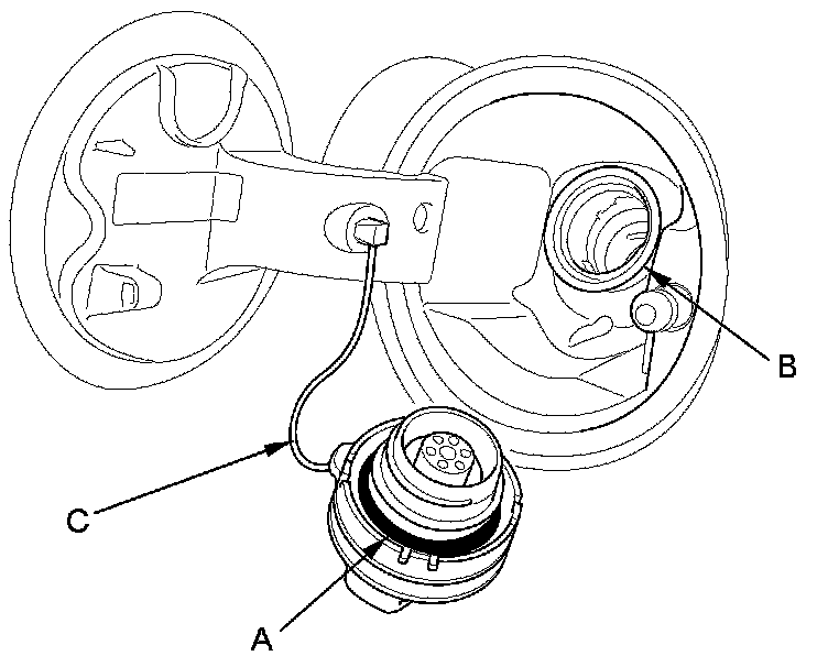 2. Check the fuel fill cap seal (A) and the fuel fill pipe mating surface (B). Make sure that the fuel fill cap tether cord (C) is not caught under the cap.