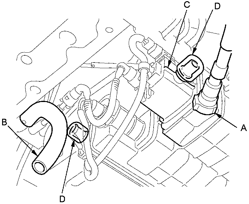 8. Disconnect the fuel tank vapor recirculation tube (A) and the fresh air hose (B) from the EVAP canister (C), then plug the EVAP canister ports (D).