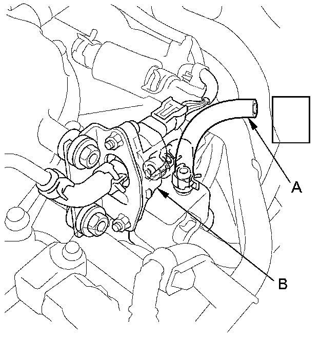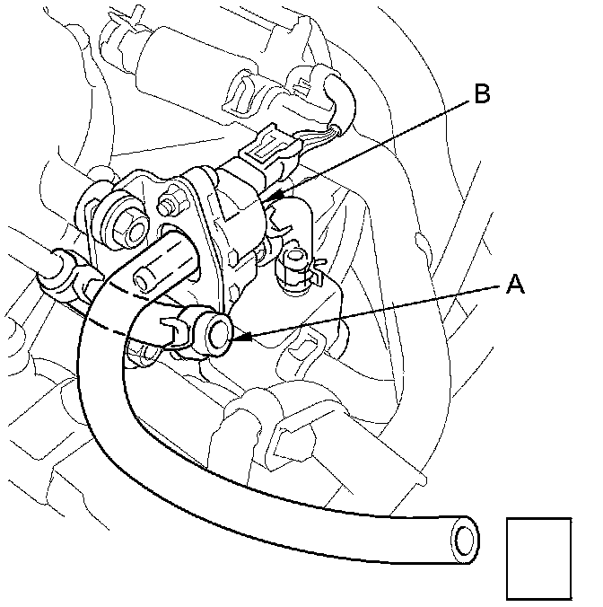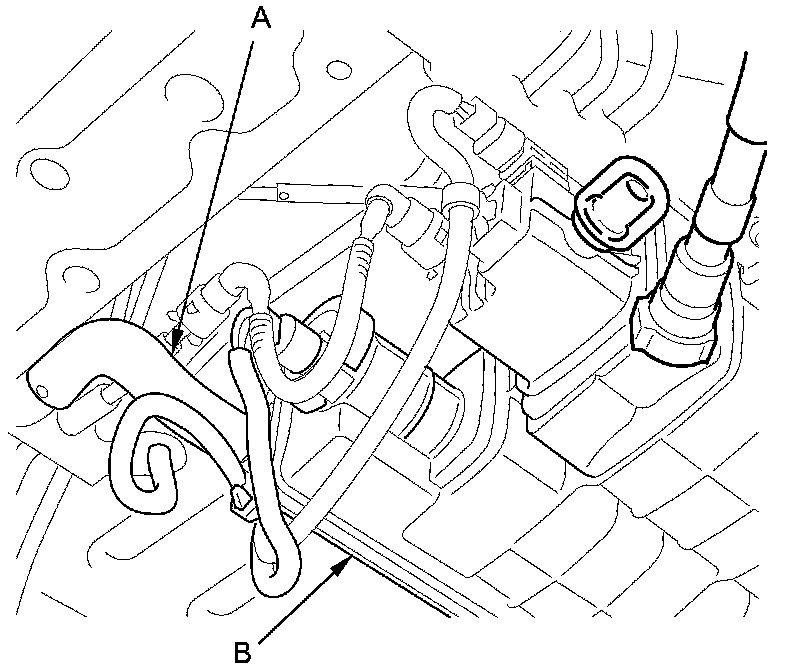 9. Disconnect the vacuum hose (engine side) (A) from the EVAP canister purge valve (B) in the engine compartment, then connect a vacuum pump/gauge, 0-30 inHg, to the purge valve as shown.