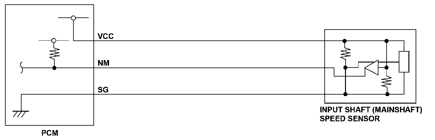 The input shaft (mainshaft) speed sensor is attached to the outside of the transmission housing. The input shaft (mainshaft) speed sensor generates a pulsing signal according to the speed of the idler gear on the input shaft (mainshaft). Using that signal, the powertrain control module (PCM) determines the speed of the input shaft (mainshaft). If no pulses occur with the input shaft (mainshaft) rotating, the PCM detects a malfunction that may be caused by an open, a temporary open, or a short to ground. Based on the velocity ratio measured by the output shaft (countershaft) speed sensor and the input shaft (mainshaft) speed sensor, the PCM detects a malfunction and stores a DTC.